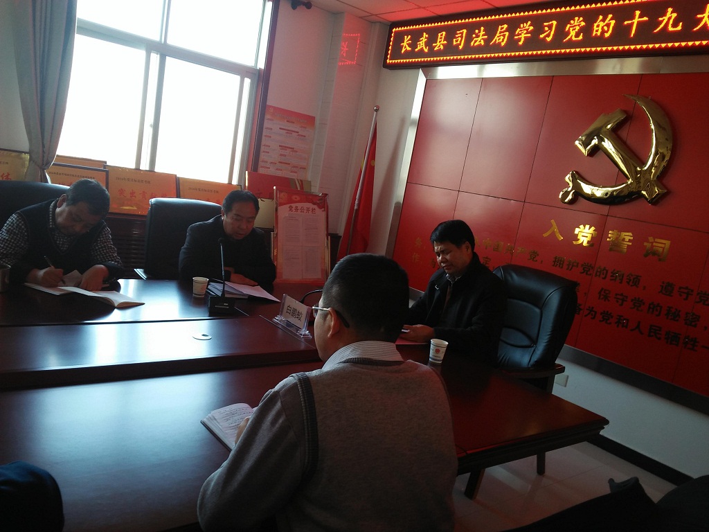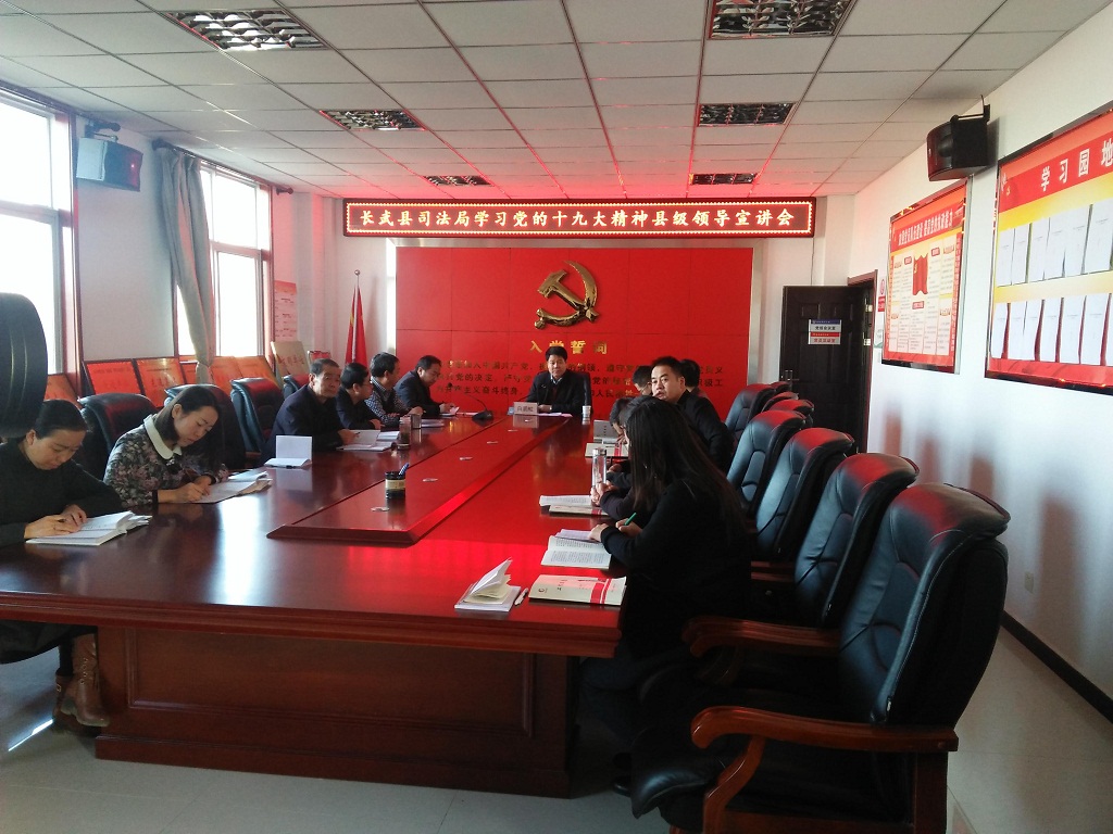 白鹏蛟县长讲到,司法行政系统干警要认真学习宣传领会党的十九大精神,指导思想和行动,不断提高司法行政工作的质量和人民满意度。白县长从三个方面对十九大精神进行了解读:一是深入学习十九大精神,牢固树立进取意识。把深入学习贯彻落实党的十九大精神作为首要政治任务,充分认识司法行政机关在全面深化改革中担负的重要职责和使命,我们每个政法干警要用中国特色社会主义理论武装头脑,坚定正确的政治方向,以新时期党的理论指导各项工作。要认清形势开拓进取,准确把握我国社会主要矛盾变化的新特点,让政法工作真正体现新时代的特征,反映新时代的要求;二是深入学习十九大精神,牢固树立公平正义的理念。把公正司法作为基本要求,坚持对人民负责与对法律负责的一致性,革除特权思想,严格依照法定权限和程序履行职责、行使权力,使有法必依、违法必究的法治理念内植于心、外践于行。坚决防止以言代法、以权压法、徇私枉法,切实维护国家法治的尊严和权威。坚持用发展的眼光来审视司法行政工作现状,理论结合实践,有的放矢的开展工作,敢于正视问题,勇于破解难题。紧紧抓住影响我们工作的关键环节,优化职权配置,健全法律宣传、司法救助体系,优化建立公正、高效、权威的机制;三是深入学习十九大精神,要解决好做实抓实的问题。坚持党的领导,一心一意跟党走,坚持以民为本,一枝一叶解民忧、惠民生,坚持从严治党,一如既往追先进、高定位,坚持严字当头,一刻不放松抓队伍、铸铁军。不忘初心、牢记司法行政工作者的使命,为建设法治长武贡献力量。