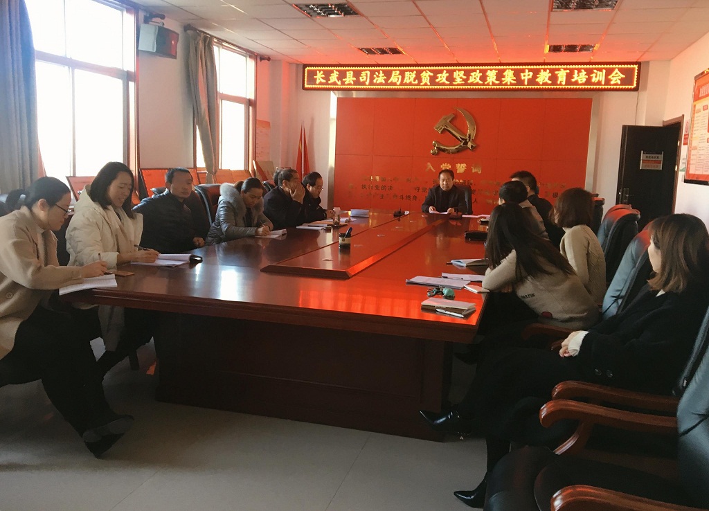 12月16日,长武县司法局根据中共县委组织部198号文件,对全体干警进行脱贫攻坚政策集中教育,局党组书记、局长秦建平同志主持学习。